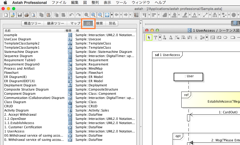 astah*では、プロジェクト内の図一覧を[図]タブで表示することができますが、出力はできません。図一覧の作成が必要な場合にご活用ください。