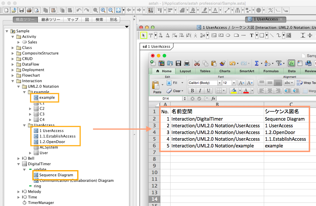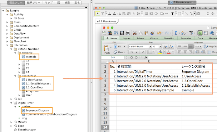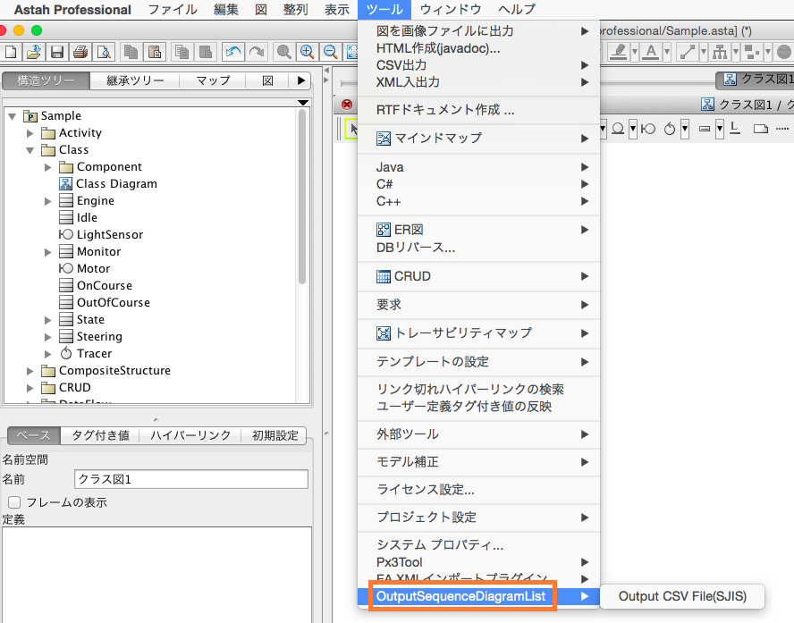 この[OutputSequenceDiagramList] – [Output CSV File (SJIS)]を選択すると、プロジェクトに含まれるシーケンス図名の一覧が、名前空間と併せてCSVファイルに出力されます。
