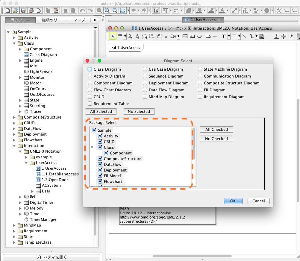 0.9.3では、出力元パッケージの指定が可能になりました。構造ツリーと同じパッケージ構造が表示され、出力対象をパッケージレベルで指定できます。0.9.3では、この他にもソート条件の改修が含まれています(第1条件:名前空間、第2条件:図名)。