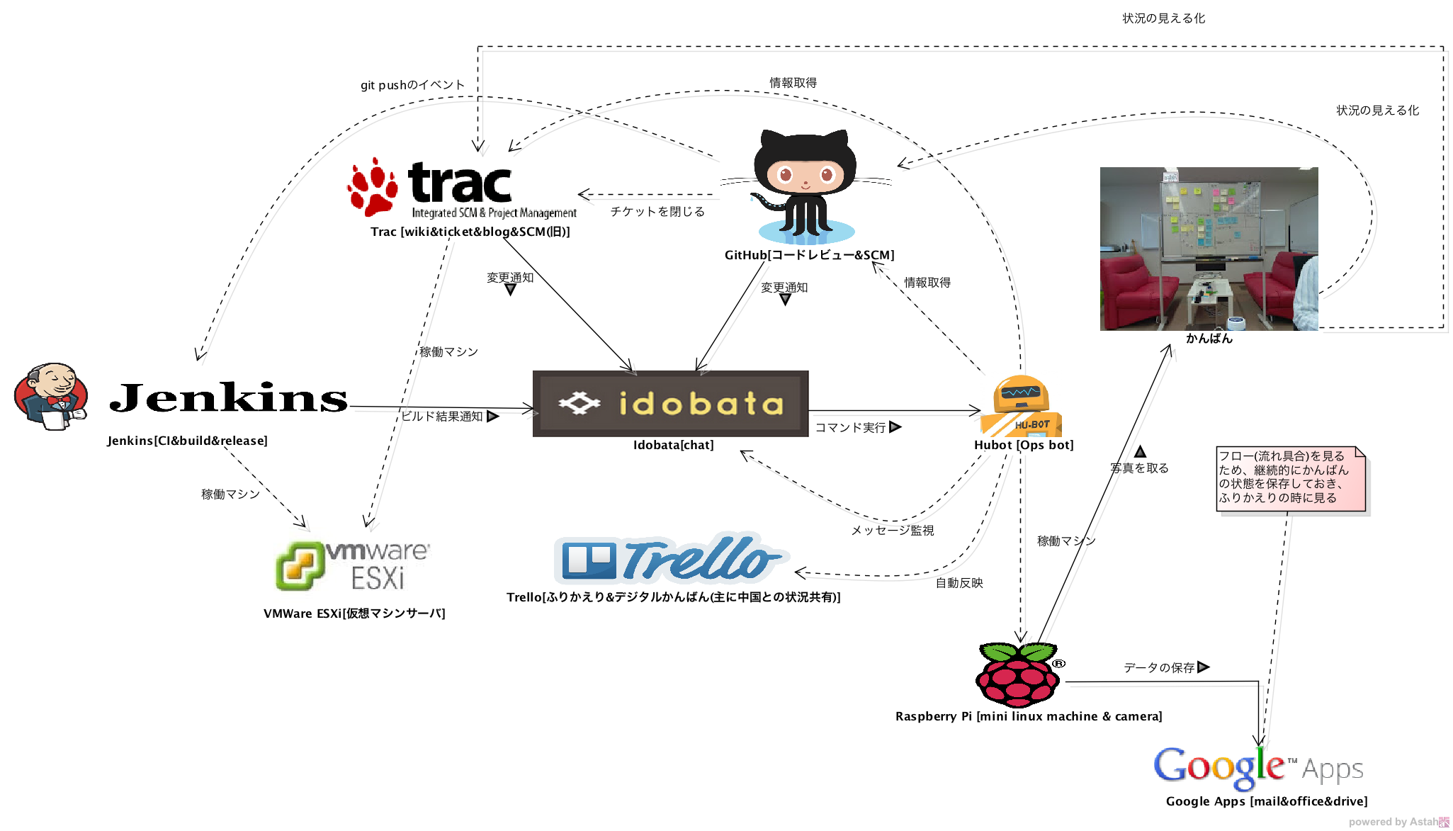 GitHubやTracの変更は逐次Idobataに通知され、HubotがIdobataに常駐することでそれぞれの変更を監視し、変更があればTrelloに反映させています。