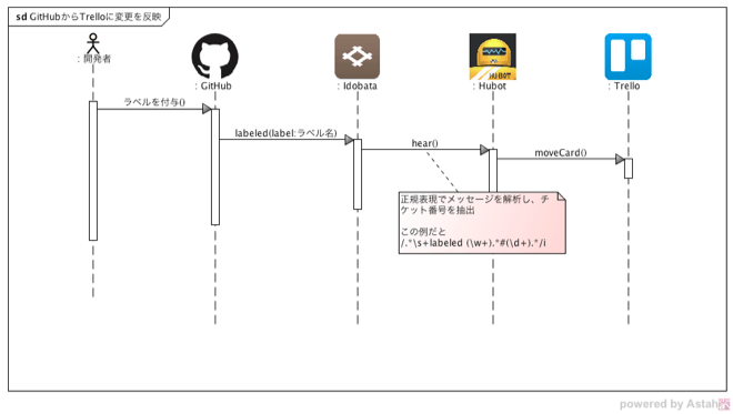 idobataはGitHubからラベルの変更を受け取ると、次のようなメッセージを出力しています。