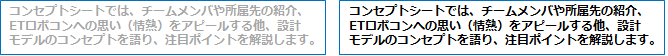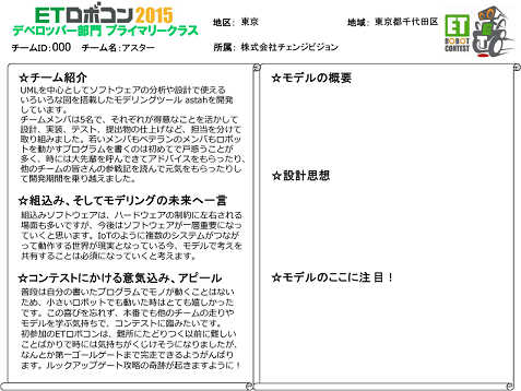ETロボコンでは、チーム紹介や設計コンセプトを記すコンセプトシートを1枚、モデルを5枚提出します(全てA3サイズ)。ここでは、 架空の参加チーム「アスター」がコンセプトシートを作りました。(注:右半分は規定の見出しのみです)