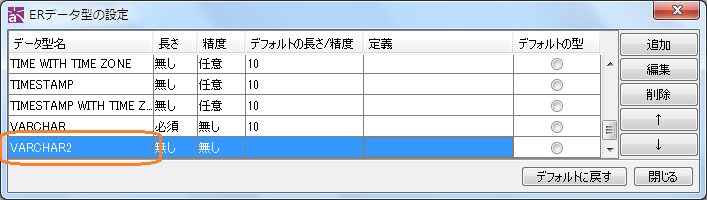 - [ERデータ型の追加]画面にあるデータ型名欄に[VARCHAR2]と入力し、[了解]を選択します