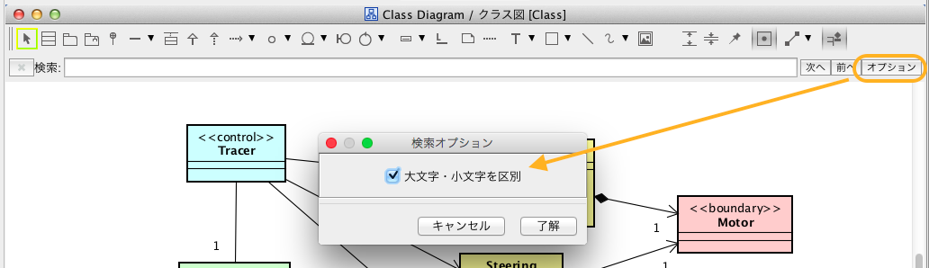 大文字、小文字を区別して検索する場合は、右端にある[オプション]ボタンを押して、切替えの設定をしてください。