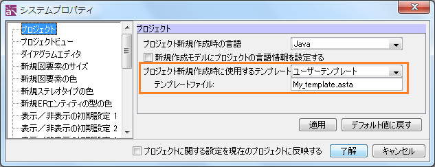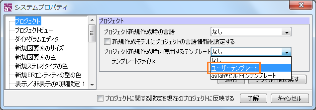 ユーザーホーム\.astah\エディション名(例:professional, community, sysml, gsn)\template\project - astah*を開き、[ツール] – [システムプロパティ] – [プロジェクト]をクリックします