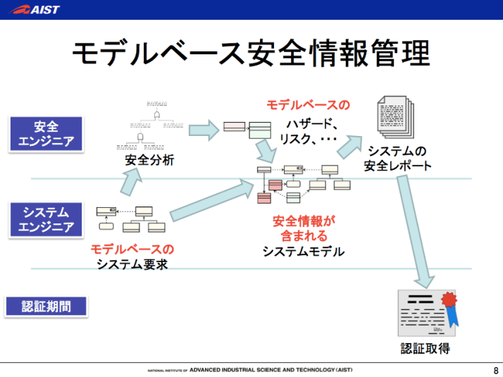 システムエンジニアがこれらを見て、安全エンジニアと一緒に、システムの安全機能を設計、システムへ追加してシステムモデルを作成します。その後、安全エンジニアが、これらの安全情報とシステム情報に基づいて報告書を作成します。最後にこの報告書を認証組織に渡して、システムの認証を行います。