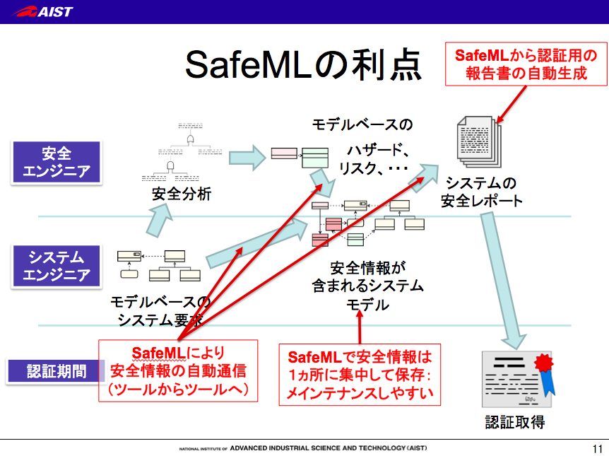 ロボット、自動車、家電などの設計に必要不可欠な「機能安全」。設計をする人、安全分析をする人、安全情報を認証する人など、システムに関わり、かつ異なる専門を持つ様々な人たちの間で、安全設計の情報を効率的に伝達、管理する手法を、国立研究開発法人 産業総合研究所のGeoffrey Biggsさんが開発されました。「SafeML」というモデリング言語を使って、安全情報をモデルベースで表現する手法です。Geoffさん本人に解説していただきました。