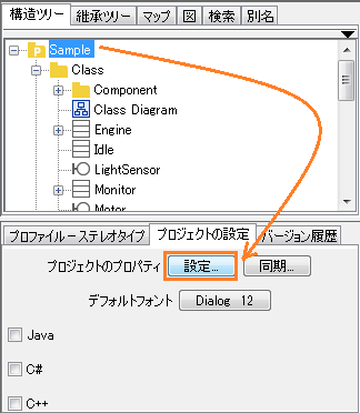 - 構造ツリー上のグラデーションを反映したいパッケージを選択し、画面左下のプロパティビューにある[プロジェクトの設定]タブをクリックし、[設定]ボタンを押下します