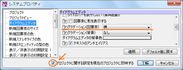 システムプロパティ画面下部にある[プロジェクトに関する設定を現在のプロジェクトに反映する]にチェックを入れなければ、既存の図にグラデーションが反映されません。