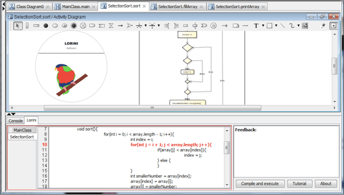 このLORINIプラグインをインストールすると、新しいビューが追加され、そこには、モデルのJavaソースコードがリアルタイムで表示されます。逆にコードをクリックすると、それに対応したモデルが図上でハイライトされます。コードビューの右隣には、モデルに誤りがある場合にそれを指摘する[Feedback]ビューがあります。