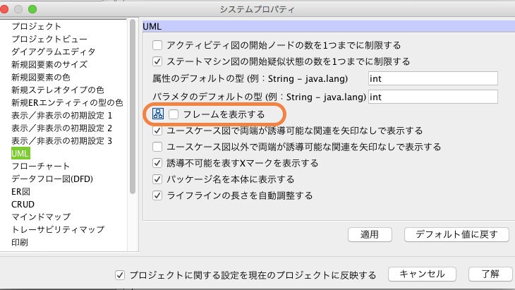 - 左メニューから[UML]を選択して、[フレームを表示する]からチェックボックスを外し、[適用] – [了解]を押します