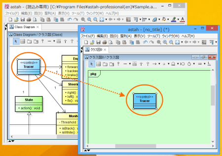 プロジェクトにあるモデル/図要素を、別のastah*で開いたファイルにコピーすることができます。(astah* communityは不可)