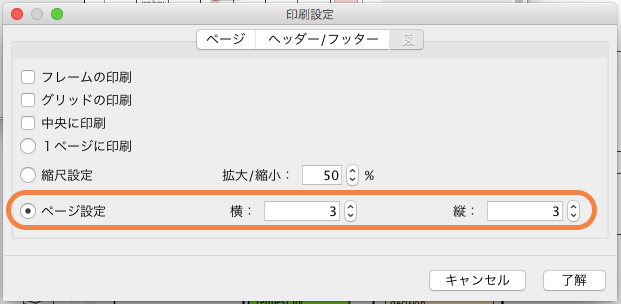 - [図]タブを選択して、 [ページ設定]から[横]、[縦]に図を分割する数を入力して、[了解]をクリックします。