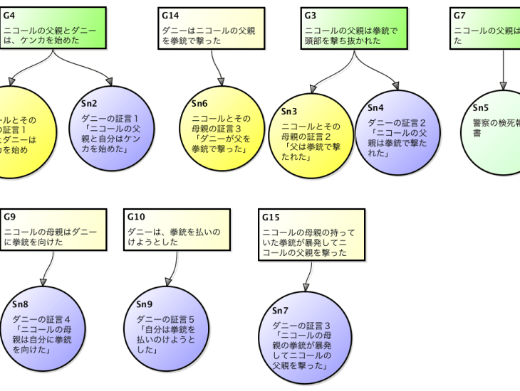 さて、これらの主張や証言などから双方のストーリーをGSN/D-Caseにより表現してみます。まずは、ニコールとその母側の主張である、ダニー犯行説を表すGSN/D-Caseからです。