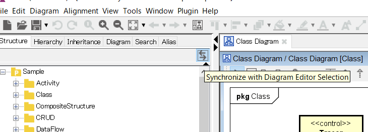 構造ツリーの上部に▼ボタンを押下すると、ボタンが出現し、このボタンをONにしておくことで、図における選択と構造ツリーの選択が同期されます。