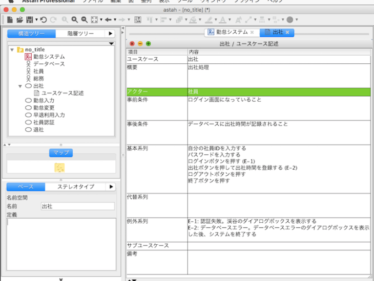 ユースケース記述はアクターの動きなど、ユースケースの内容を具体的に記述しその理解を助けるために作成される文章ですが、有償版のastah*でも作成可能です。