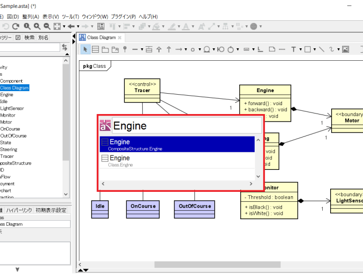 要素をダブルクリックするか、または目的の図要素がコマンド入力Windowの一番上にある時にEnterキーを押すと、構造ツリー上で該当の要素にジャンプできます。簡単にクラスやパッケージを見つけられますね。