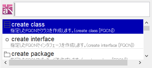 ホットキー(デフォルトではCtrl+Space)を押すと、コマンドを入力するWindowが表示されます。このWindowに検索したいクラス名やパッケージ名を入力します。