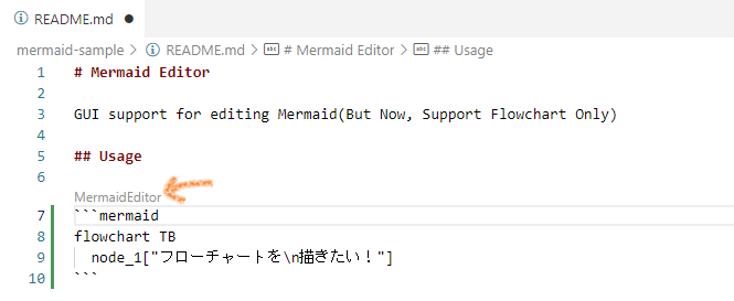 拡張をインストール後、Markdown ファイル(.md)内の Mermaid コードブロック上部の `MermaidEditor` をクリックすることでエディタビューが開きます。