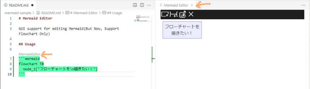利用を終える場合は、エディタビューを閉じるか、編集中コードブロック上部の `MermaidEditor` をクリックします。