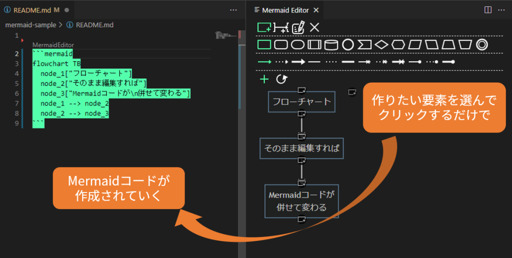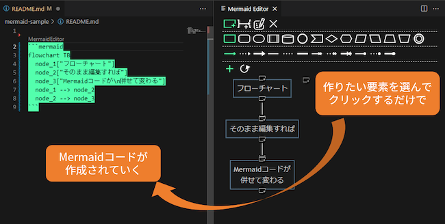 基本的なフローチャートであれば、アイコンをクリックして繋げていくだけで、フローチャートを描画でき、且つMermaidコードが自動で作成されます!