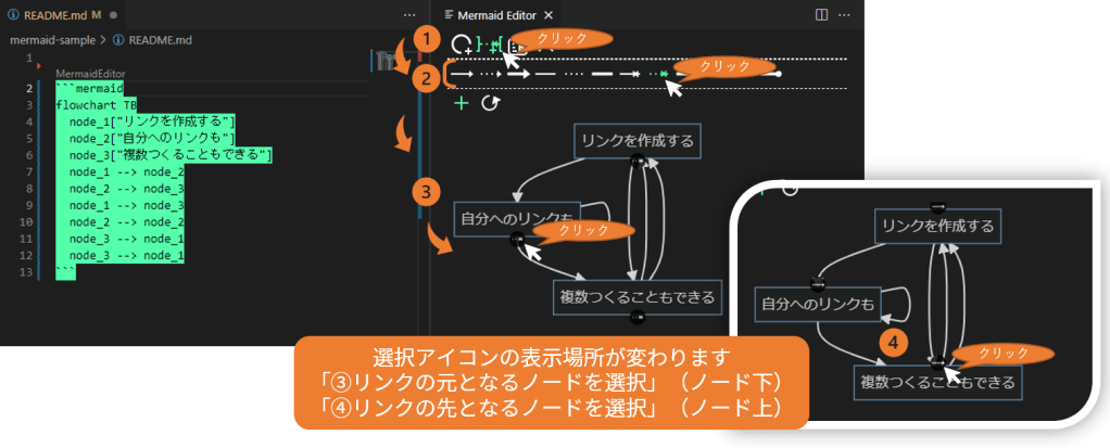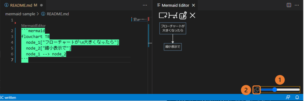 - Markdownファイル(.md)にMermaidコードブロックを作成します(①)