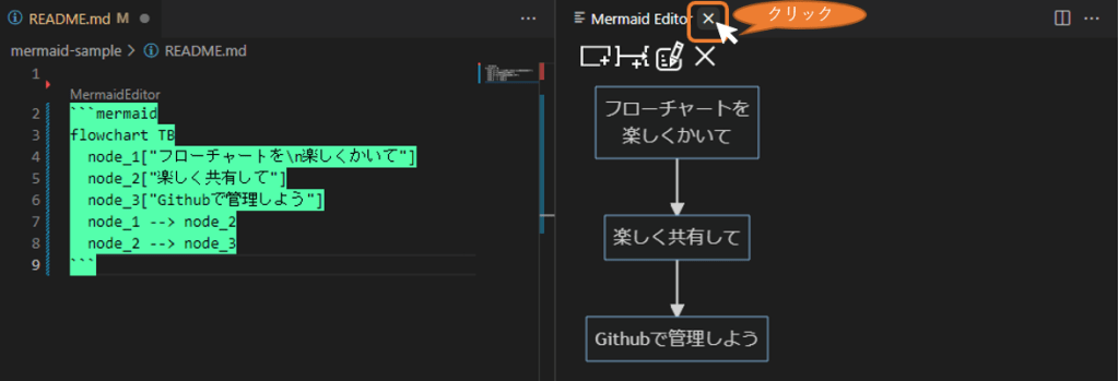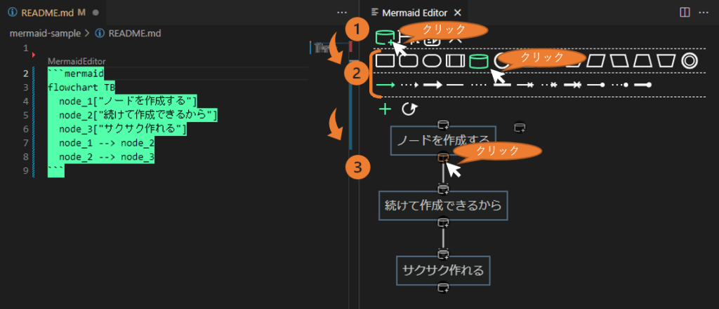 - 作成したコードブロック上部に「MermaidEditor」と表示されるので、これをクリックします(②)