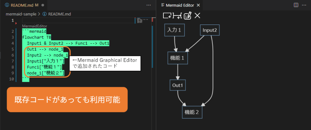 Mermaid Graphical Editorは、編集された内容のみをコードに反映するようにしているため、既存のMermaidコードがあれば、そのまま「Mermaid Graphical Editor」で使用/編集することもできます。