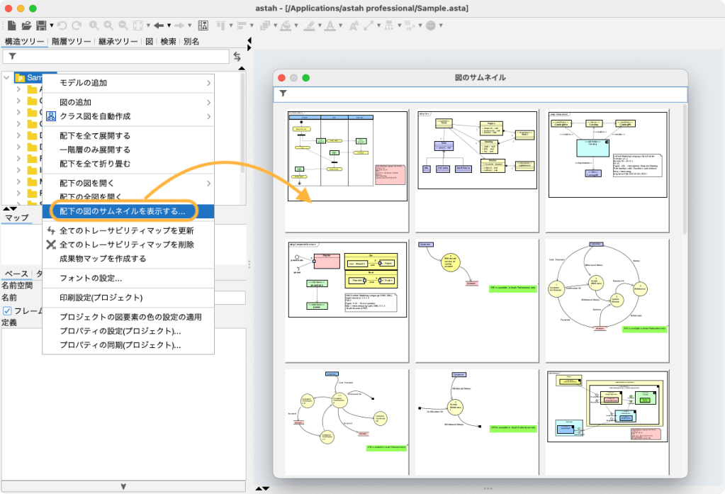 この機能を使う事で、どのような図がプロジェクト/パッケージ内に存在するかが直感的に分かり、サムネイルをダブルクリックすると、該当の図を開く事ができます。