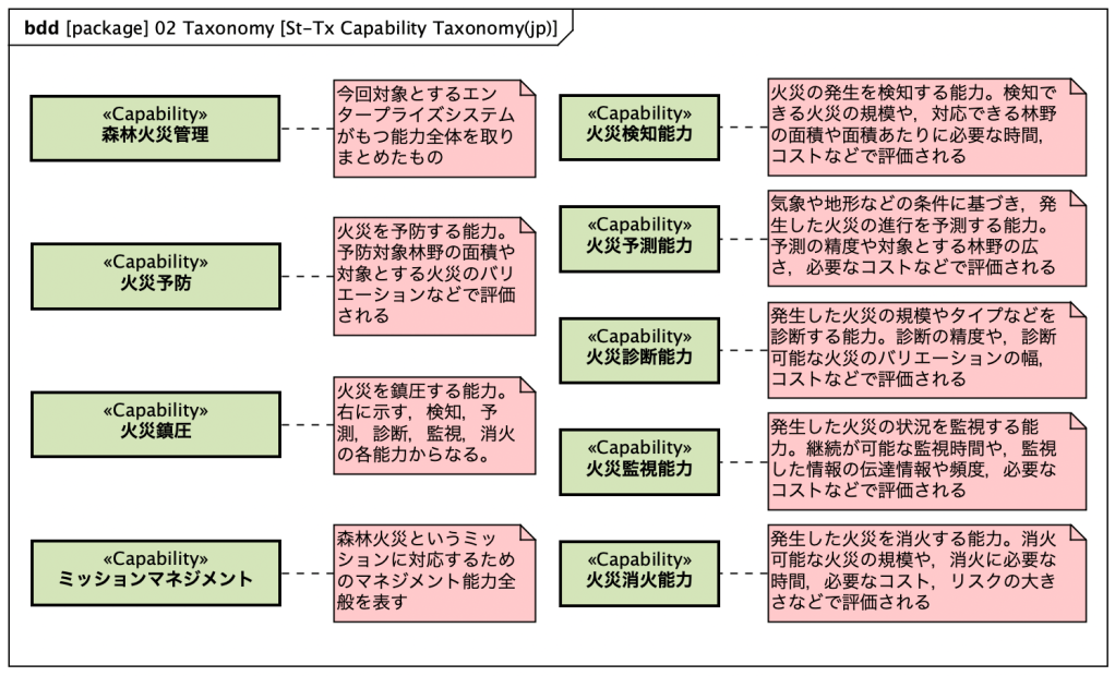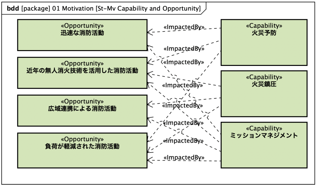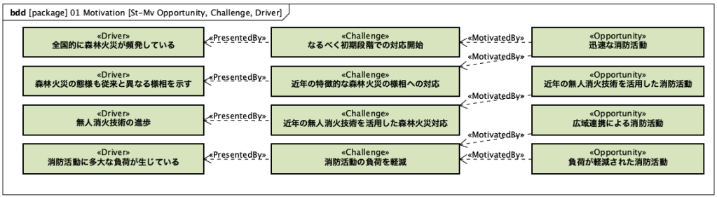 ここでは、ケーパビリティが導出された背景やその根拠について定義します。例えば、UAFでは、ケーパビリティの他に、ドライバー(Driver)、チャレンジ(Challenge)、オポチュニティ(Opportunity)という概念が規定され、さらにそれらの間の関係についてもいくつか定義されています。これらの概念はエンタープライズシステムズエンジニアリングで使われる概念で、ケーパビリティが導出される背景をモデルとして記述できるようになります。森林火災対応システムでは、例えば次のように書けます。