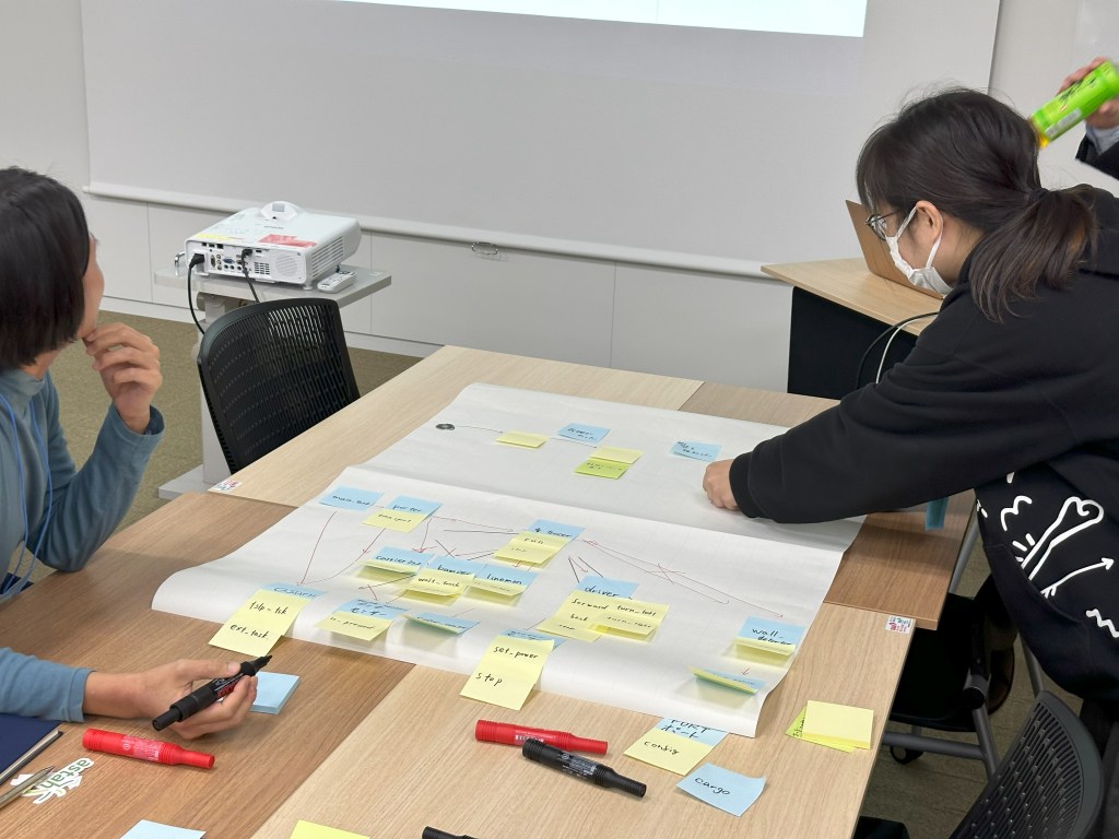 使用した道具は、模造紙とポストイットという実にシンプルなもので、これは「ツールの使い方ではなく、モデリングの学びをより吸収する」ことが目的です。確かに、ツールの使い方を意識せずに、モデリングの練習に集中できることができました。