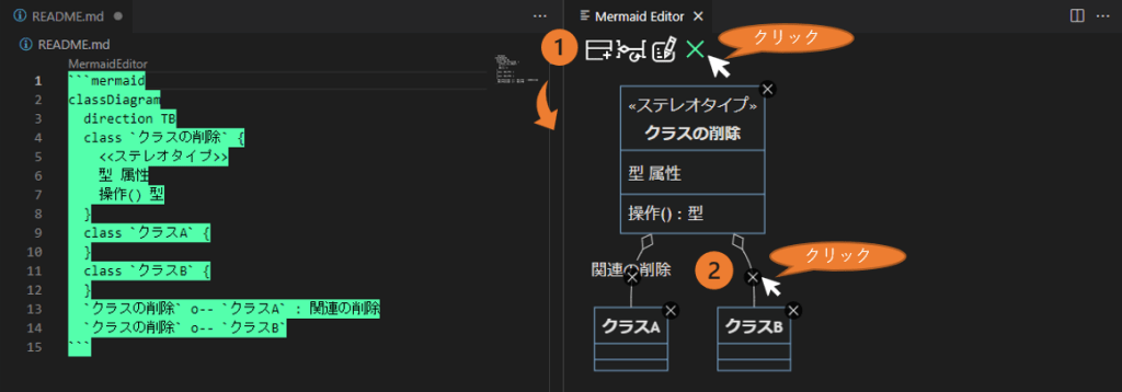 - 作成したコードブロック上部に「MermaidEditor」と表示されるので、これをクリックします(②)