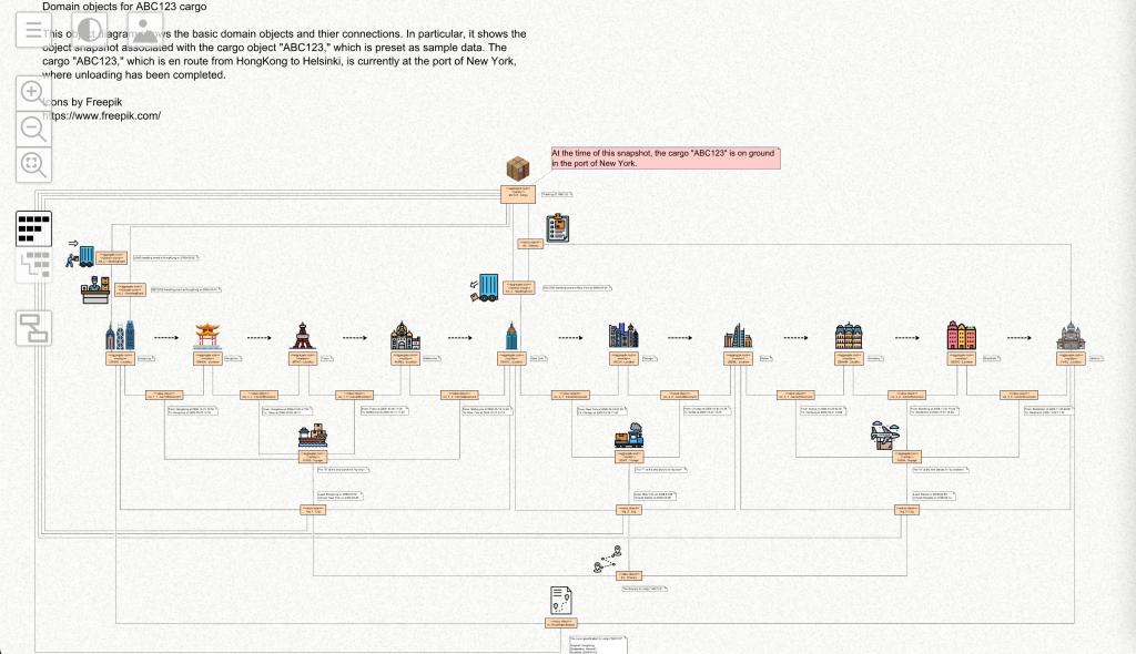 このオブジェクト図は、基本的なドメインオブジェクトとその関係を示しています。特に、サンプルデータとして用意された貨物「ABC123」に関するスナップショットを表しています。