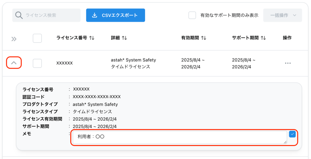 今回のアップデートで追加した「メモ」機能により、ライセンスごとに実際の利用者名や更新に関する情報などを記録・管理できるようになりました。