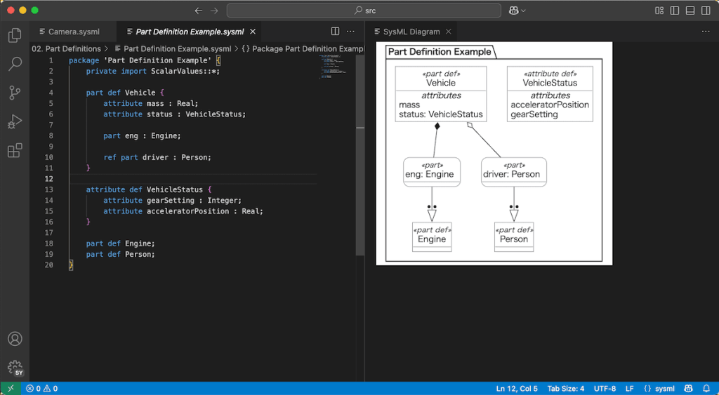 SysML v2 Textに準拠したモデル記述用のエディタです。Visual Studio Code上で動作し、以下の設計・記述支援機能を備えています。