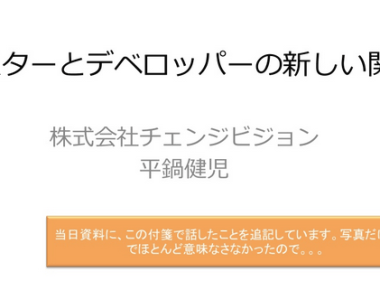 「テスターとデベロッパーの新しい関係」- 資料公開 投稿者: Satomi Joba 投稿日: 3月 12, 20154月 20, 2015 event 2015年2月20-21日の2日間開催された「JaSST’ […] 続きを読む